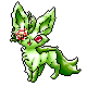 Floreon is a tiny, fox-like Toshimon with a grass-green colored fur and body. It has a bushy tail that is a grass moss. It has a ruff that is alike to its ears. Floreon’s right eye’s a fuschia vined-flower and is the same color as its left. In a rainforest, the king would be a lion, but the queen is Floreon. It was typical for an animal to mutate and grow in various habitats; Eros was roaming the forest when it encountered a thirteen-leaf plant and ate it, a few days later vines and mosses started to grow all over its body. Floreon as a Toshimon can adapt to any environment with soil or trees, but to be in a rainforest will enhance its strength. This Toshimon’s not hard to catch as it is always around the bush playing with the grasshoppers or eating petals. Its symbiote will cling to any opponent and infiltrate their minds.